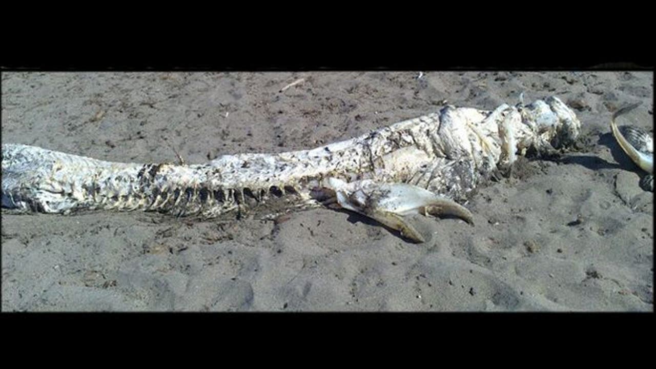 Dragon, Loch Ness Monster or really strange fish? Photos of a mystery creature washed ashore on the beaches of Andalusia in Spain have beach goers crying mutant fish.
