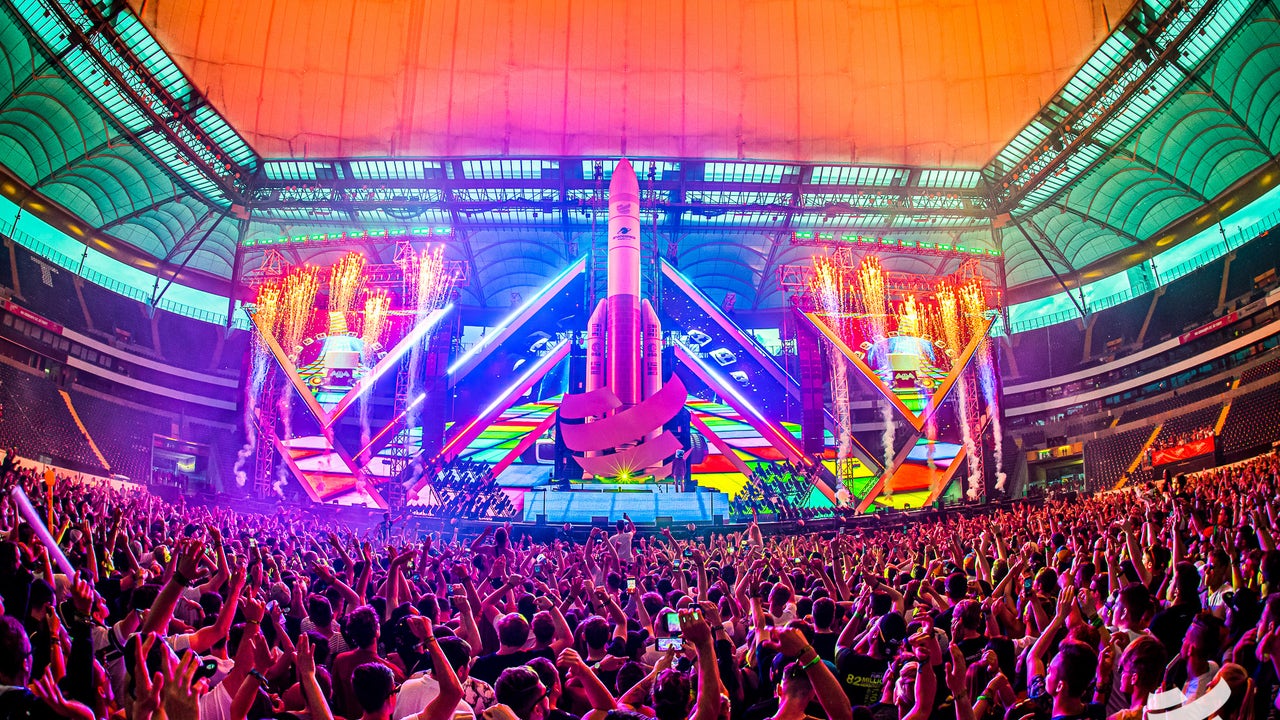 (The Main Stage (inside the Commerzbank Arena in Frankfurt, Germany) during Marshemllo's performance on June 7th, 2019, of BigCityBeats WORLD CLUB DOME: Space Edition. )