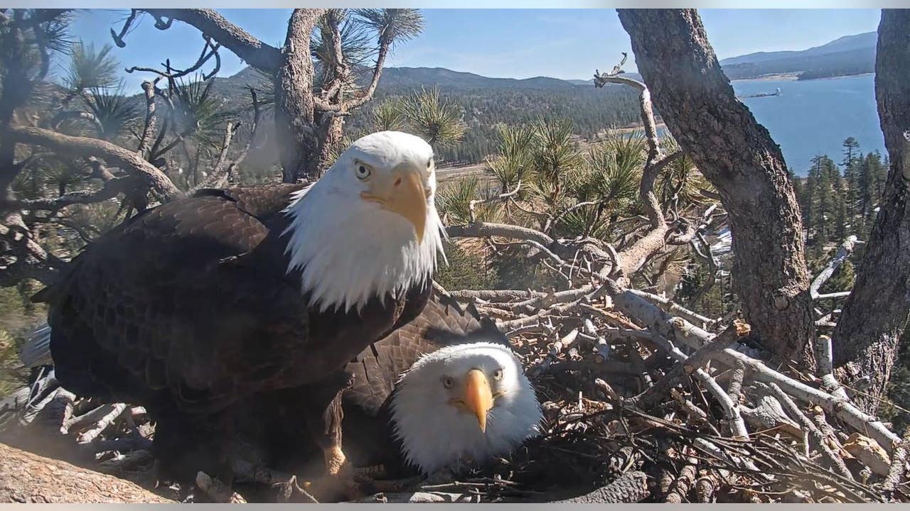 Both eagles have been intensively monitored and live-streamed by Friends of Big Bear Valley during the process, which routinely captures Jackie sitting in the nest, while her mate Shadow goes out to hunt for food.