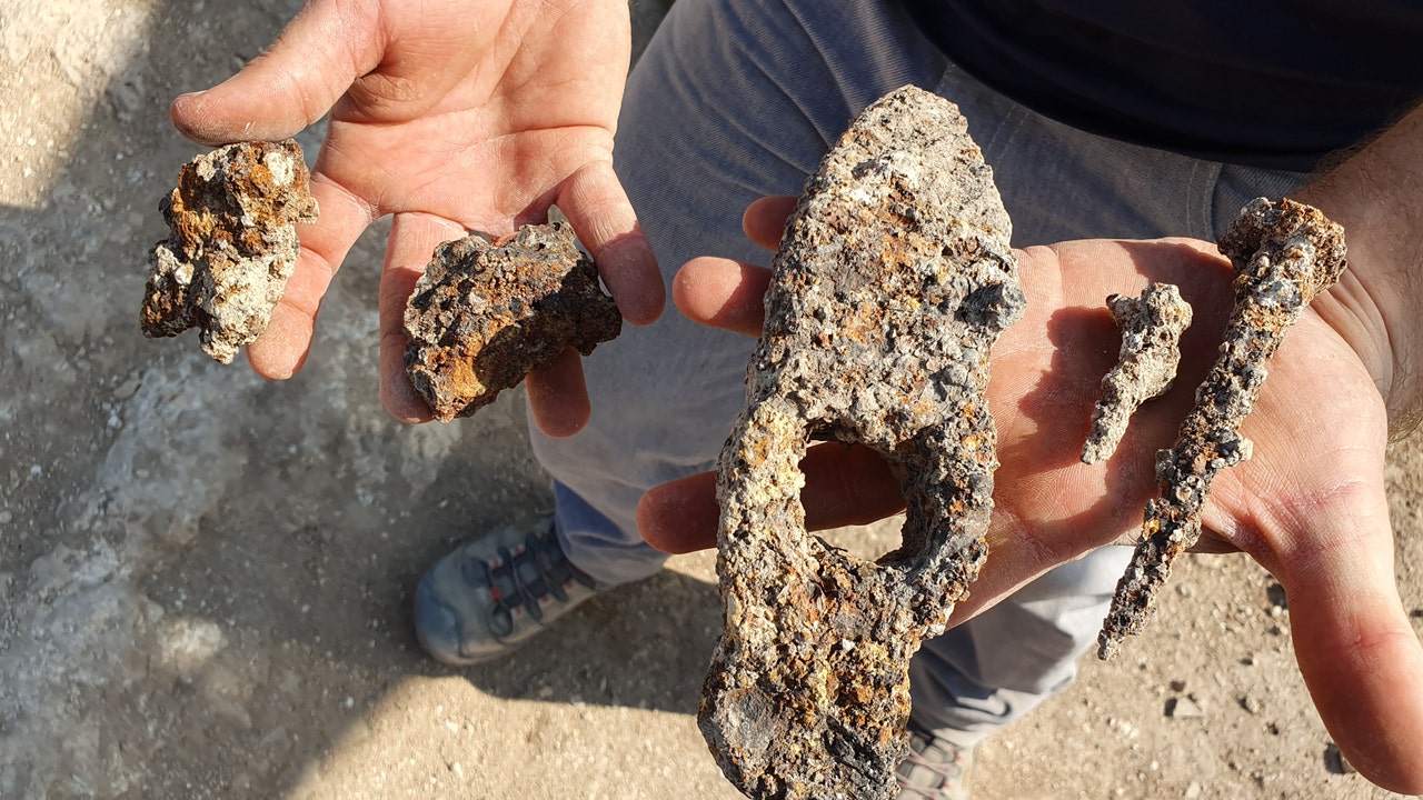 The ancient iron hammer and nails that were found during the Usha excavation. (Yoli Schwartz, Israel Antiquities Authority)