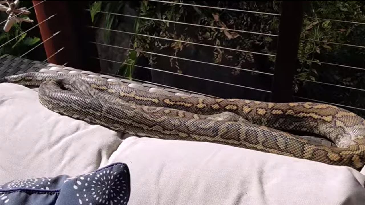 An Australian family was flabbergasted after they found a nearly 7-foot-long carpet python sunbathing and taking a nap on their deck.