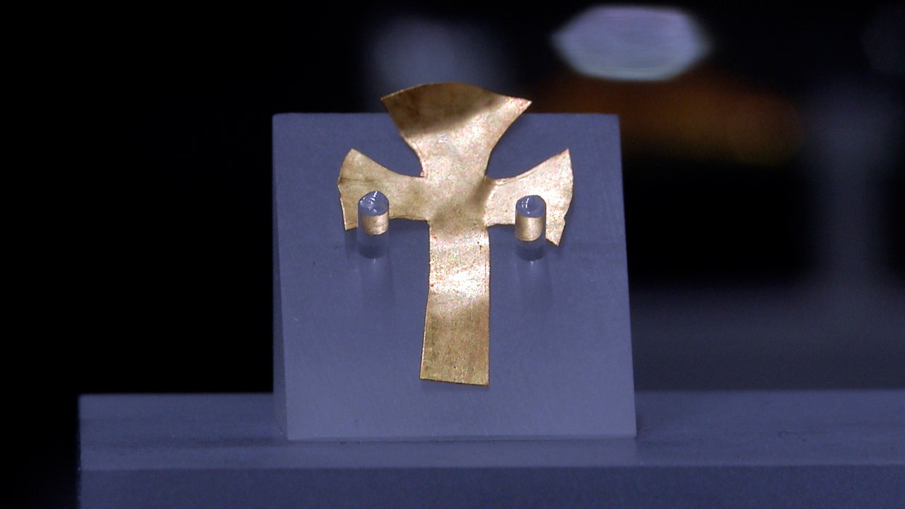 A gold foil cross uncovered at an Anglo-Saxon burial site in the village of Prittlewell in 2003 on display at Southend Central Museum in Southend, England, on May 8, 2019. (AP Photo/James Brooks)