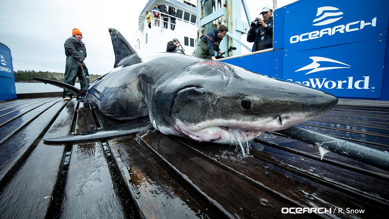 The shark, named Vimy, was caught and tagged in the North Atlantic Ocean on Oct. 4, said OCEARCH, an international great white shark research organization. Scientists tagged a total of 11 sharks for satellite tracking while on an expedition to Nova Scotia to study their habits, the group said in a news release.