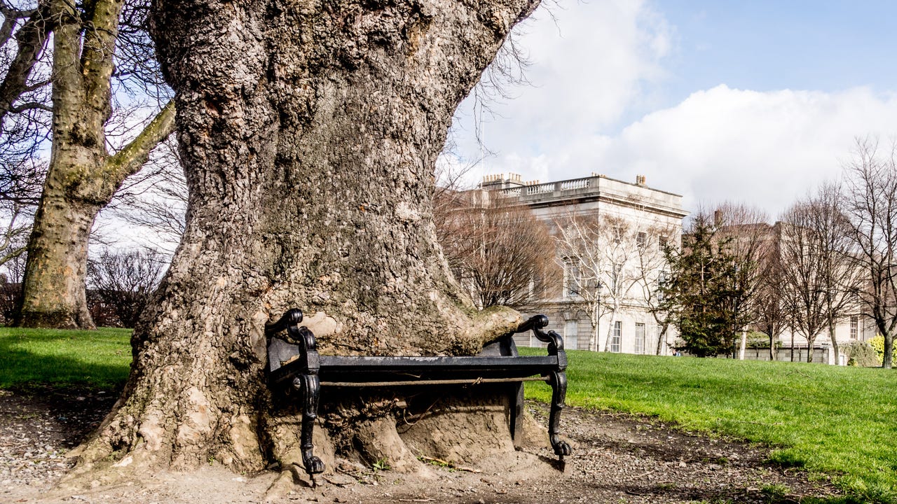 A London Plane tree that sits on the grounds of a university in Ireland appears to be eagerly eating a cast iron bench.
