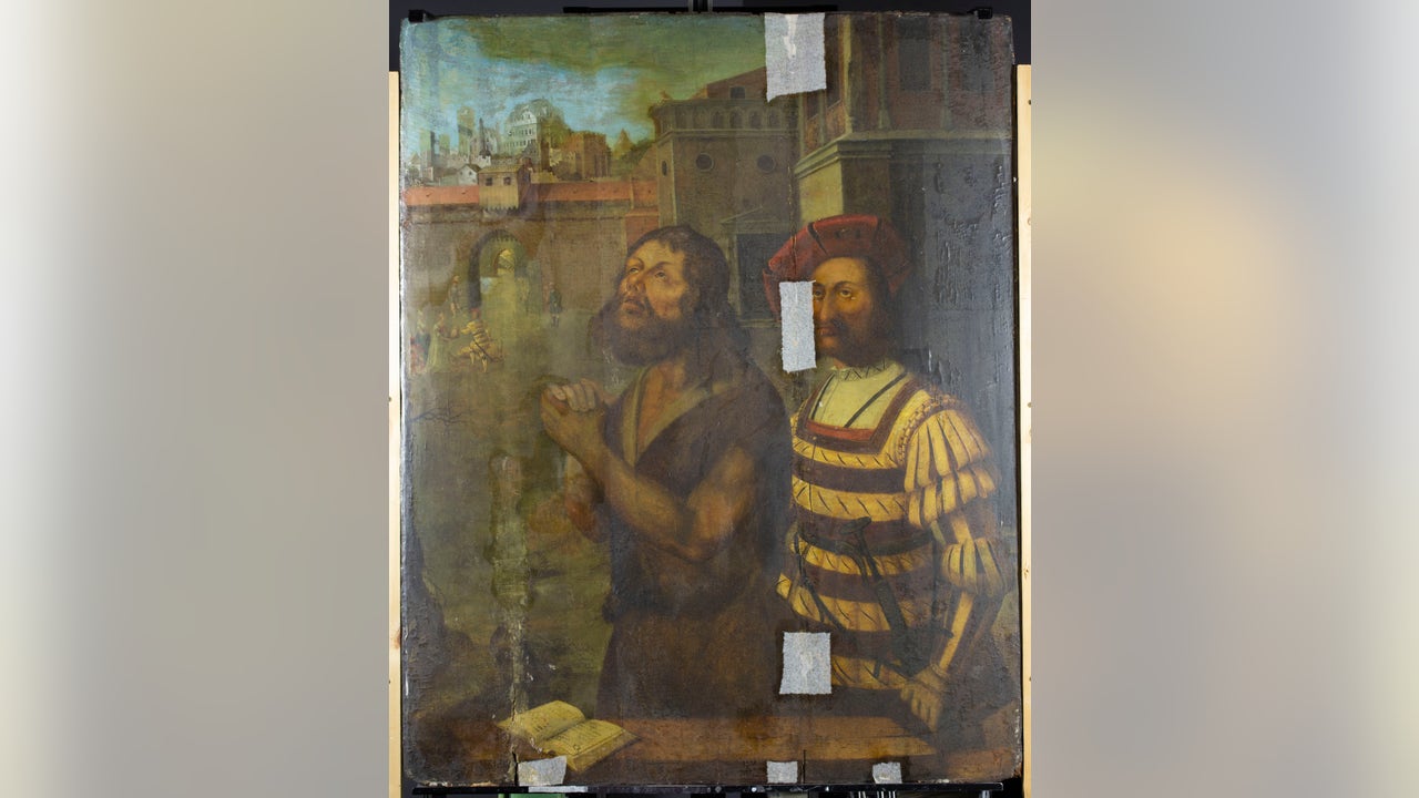 The artwork, which is believed to be around 400 years old and is painted in the late medieval style, shows the beheading of St. John the Baptist. It is painted onto a piece of canvas spread over a large wooden panel.