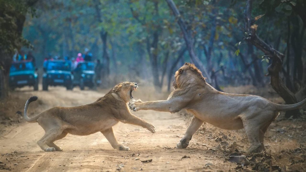 A photographer in India captured an epic showdown between a lioness and a lion that is actually a pre-mating ritual.