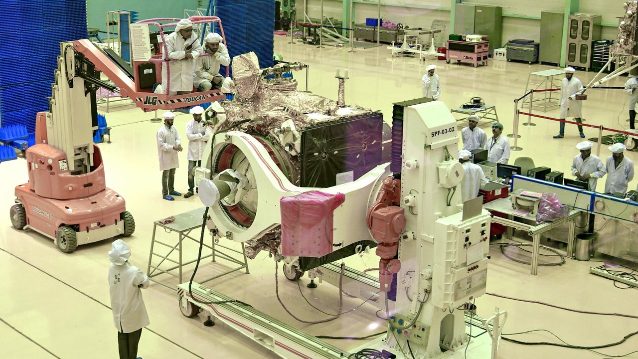 Indian Space Research Organization (ISRO) scientists work on the orbiter vehicle of Chandrayaan-2, India's first Moon lander and rover mission, in Bangalore. (MANJUNATH KIRAN/AFP/Getty Images)