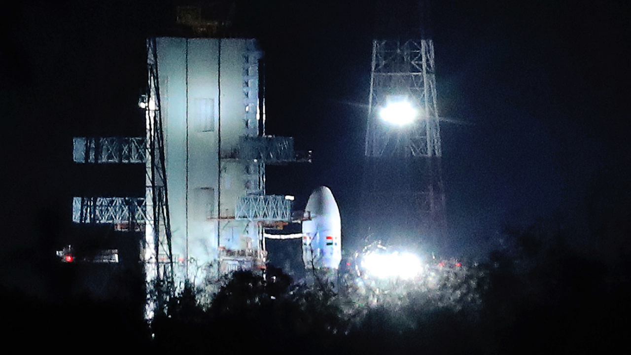 Indian Space Research Organization (ISRO)'s Geosynchronous Satellite launch Vehicle (GSLV) MkIII carrying Chandrayaan-2 stands at Satish Dhawan Space Center after the mission was aborted at Sriharikota in southern India, Monday, July 15, 2019. India has called off the launch of a moon mission to explore the lunar south pole. The Chandrayaan-2 mission was aborted less than an hour before takeoff on Monday. An Indian Space Research Organization spokesman says a "technical snag" was observed in the 640-ton launch-vehicle system. (AP Photo/Manish Swarup)