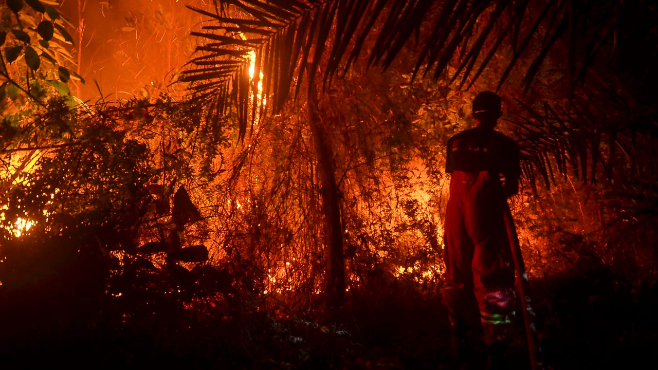 TOPSHOT - This picture taken on September 19, 2019 shows firefighters battling a forest fire near Pekanbaru, Riau. Indonesia is battling forest fires causing toxic haze across southeast Asia with aircraft, artificial rain and even prayer, President Joko Widodo said during a visit to a hard-hit area. (Photo by Wahyudi / AFP) (Photo credit should read WAHYUDI/AFP/Getty Images)
