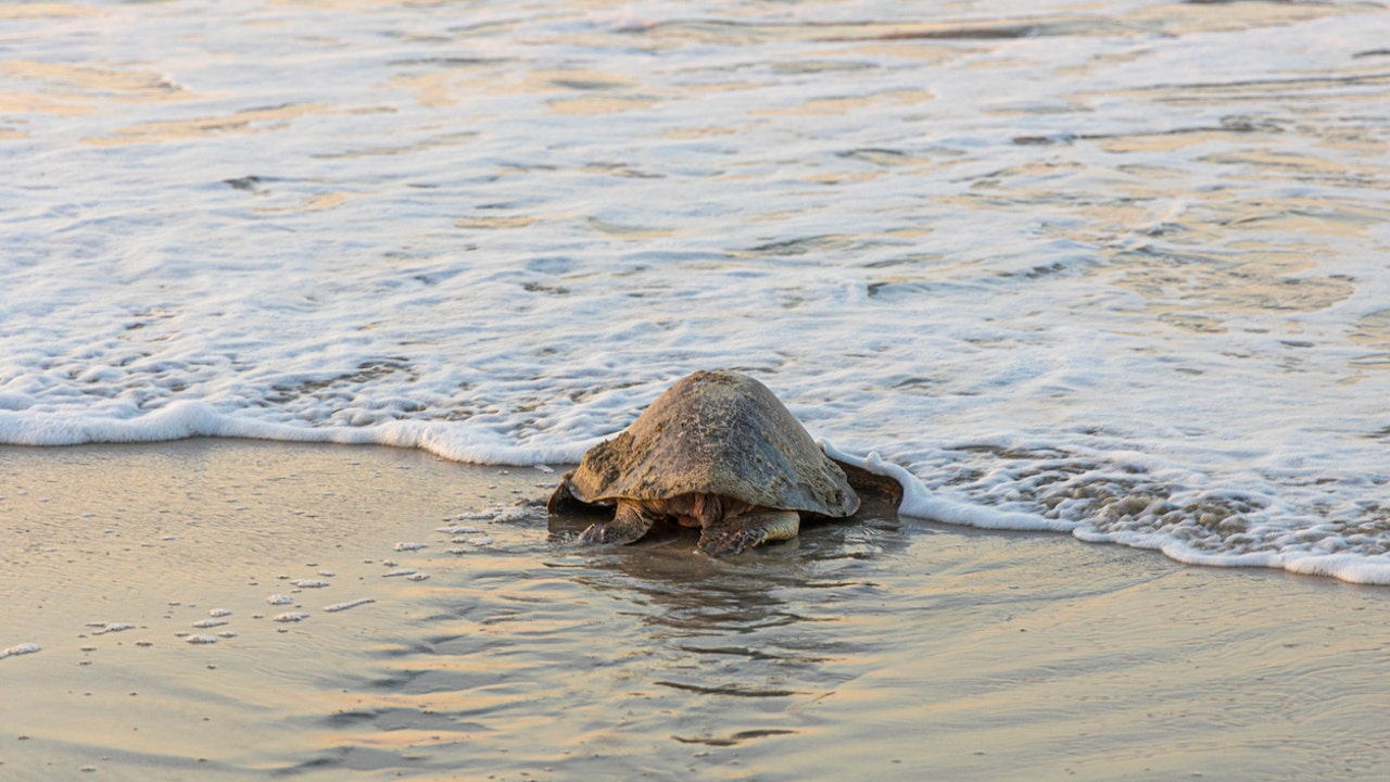 FILE - In this July 5, 2019, file photo provided by the Georgia Department of Natural Resources, a loggerhead sea turtle returns to the ocean after nesting on Ossabaw Island, Ga. A federal judge ordered an injunction Thursday, May 20, 2021, stopping the scheduled dredging of a Georgia shipping channel because of threats to nesting sea turtles. The Army Corps of Engineers wants to scrap a policy that for 30 years has protected rare sea turtles from being mangled and killed by dredged used to suck sediments from harbors in four Southern states. (Georgia Department of Natural Resources via AP, File)