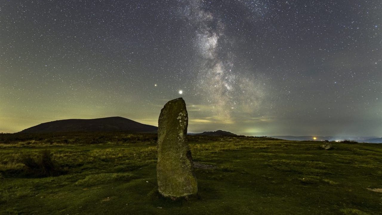 A remarkable picture shows the two largest planets in the solar system, Jupiter and Saturn, in the night sky over the legendary Mitchell's Fold stone circle.