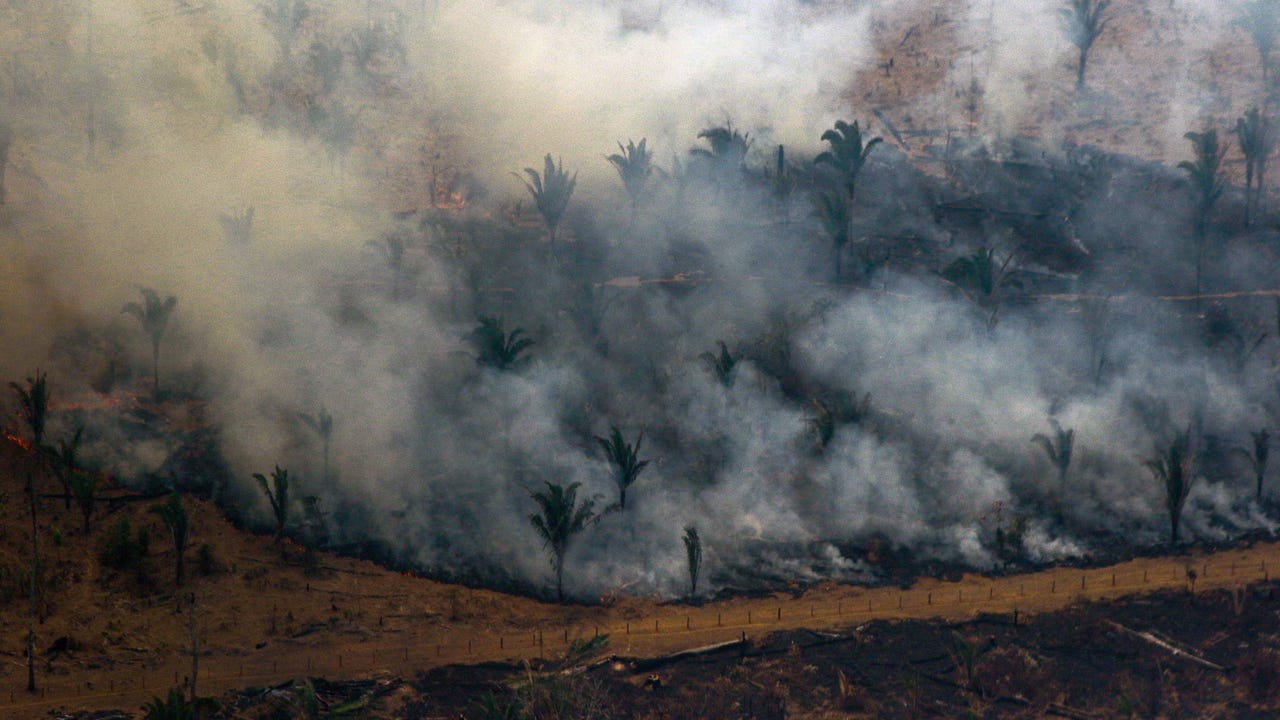 Aerial view showing smoke billowing from a patch of forest being cleared with fire in the surroundings of Boca do Acre, a city in Amazonas State, in the Amazon basin in northwestern Brazil, on Aug. 24. (LULA SAMPAIO/AFP via Getty Images)