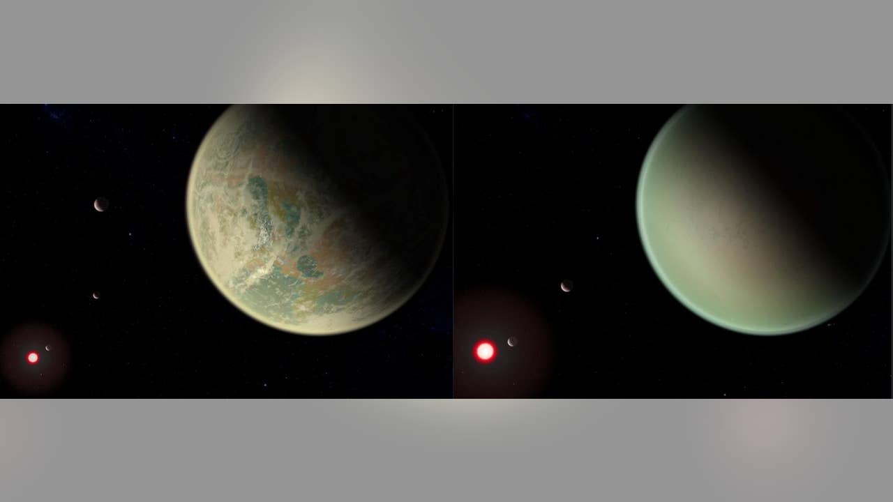 Conceptual image of water-bearing (left) and dry (right) exoplanets with oxygen-rich atmospheres. (NASA/GSFC/Friedlander-Griswold)
