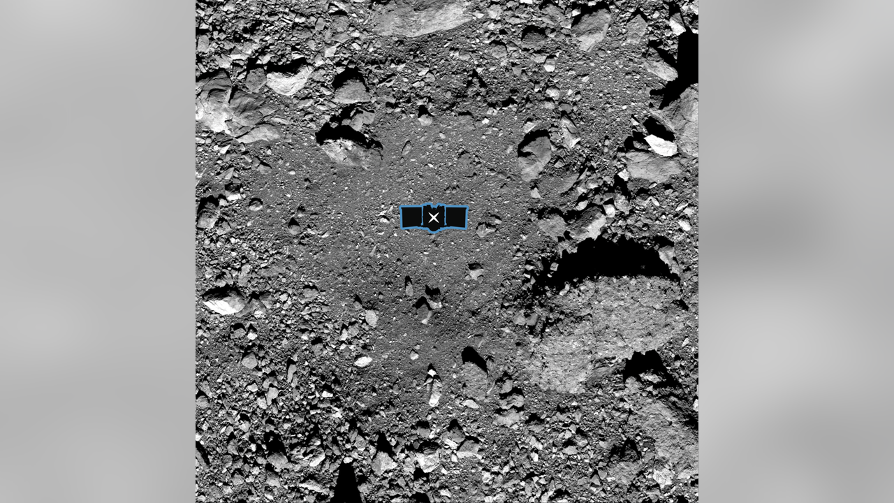 This image released by NASA shows sample site Nightingale, OSIRIS-REx’s primary sample collection site on asteroid Bennu. The image is overlaid with a graphic of the OSIRIS-REx spacecraft to illustrate the scale of the site. (NASA/Goddard/University of Arizona)