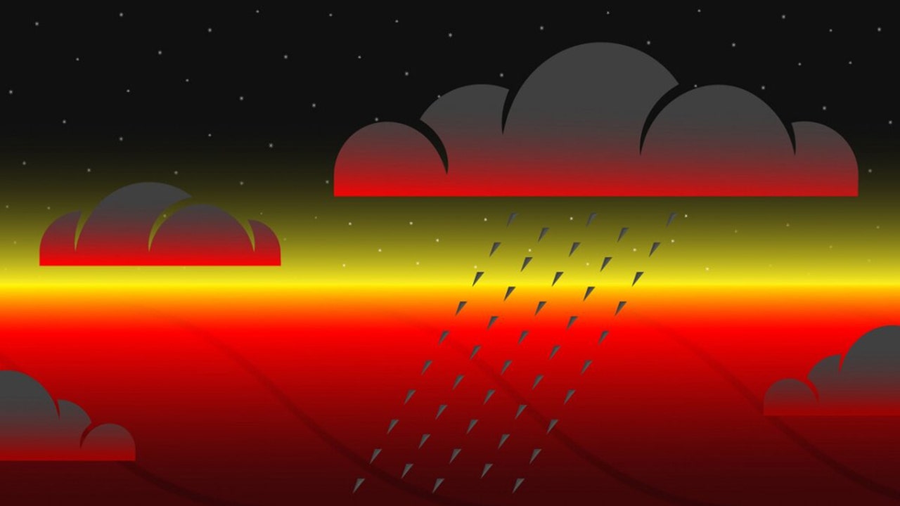 Schematic of clouds on the night side of a hot Jupiter exoplanet. The underlying atmosphere is over 800 C, hot enough to vaporize rocks. Atmospheric motion from the deep atmosphere or from the hotter dayside bring the rock vapour to cooler regions, where it condenses into clouds, and possibly rains down into the atmosphere below. These clouds of condensed rock block outgoing thermal radiation, making the planet's nightside appear relatively cool from space. Credit: McGill University