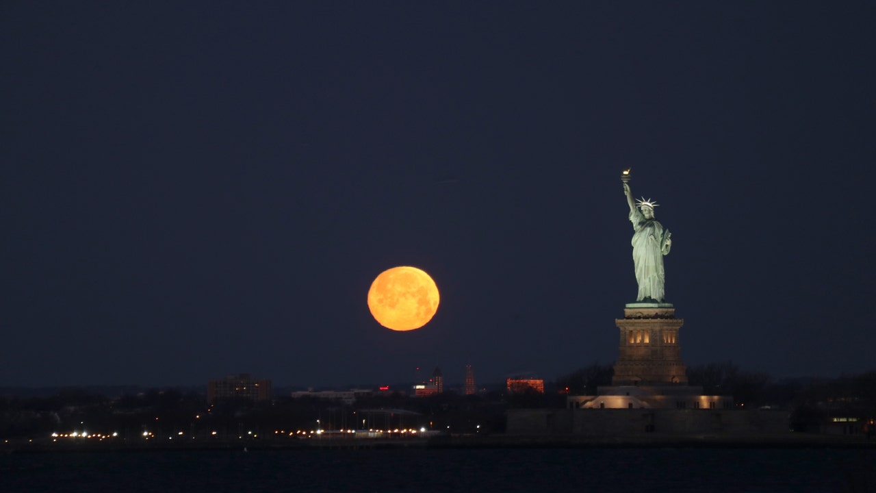 In New York City, photographers braved the cold on the waterfront at Red Hook, Brooklyn on Feb. 8 to capture images of the almost-full moon behind the Statue of Liberty.