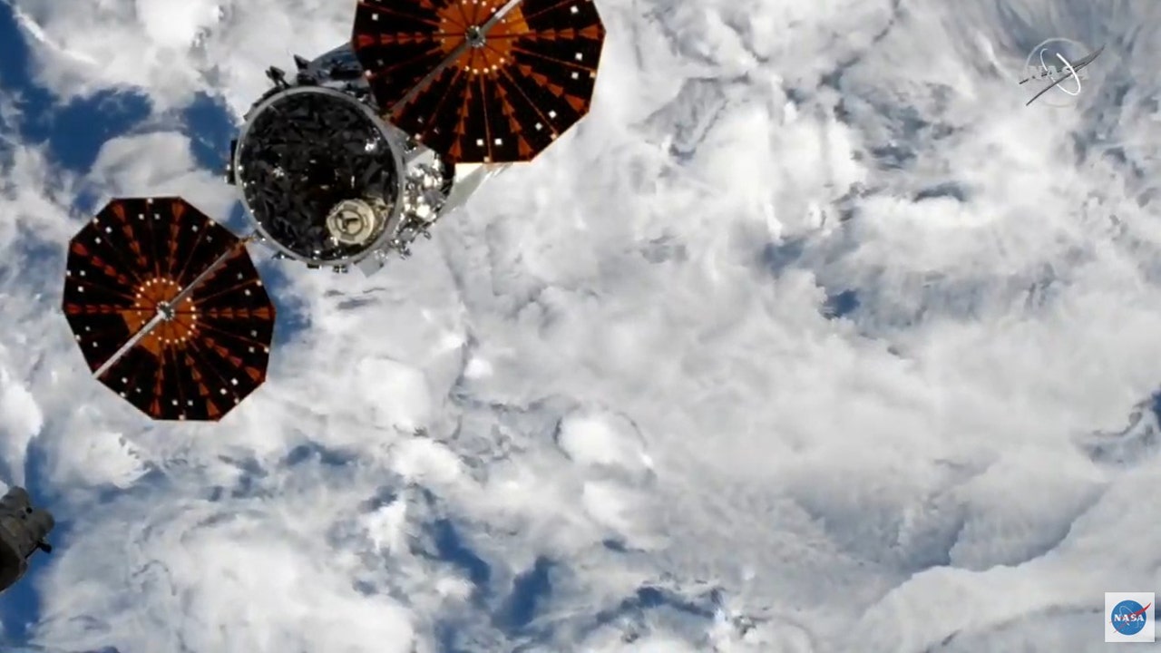 The Cygnus spacecraft shortly after its undocking from the International Space Station. (NASA TV)