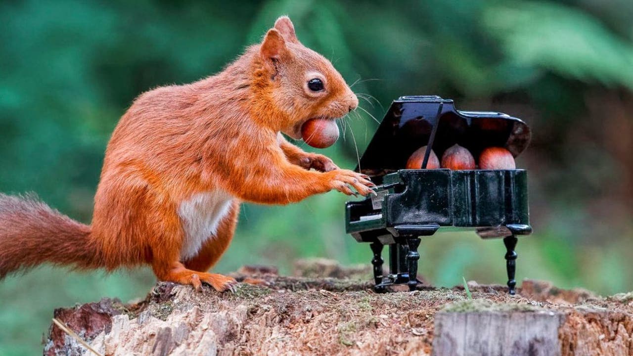 A wildlife photographer in Scotland has captured remarkable images showing a red squirrel reaching out for hazelnuts encased in a miniature grand piano, British news agency SWNS reports.