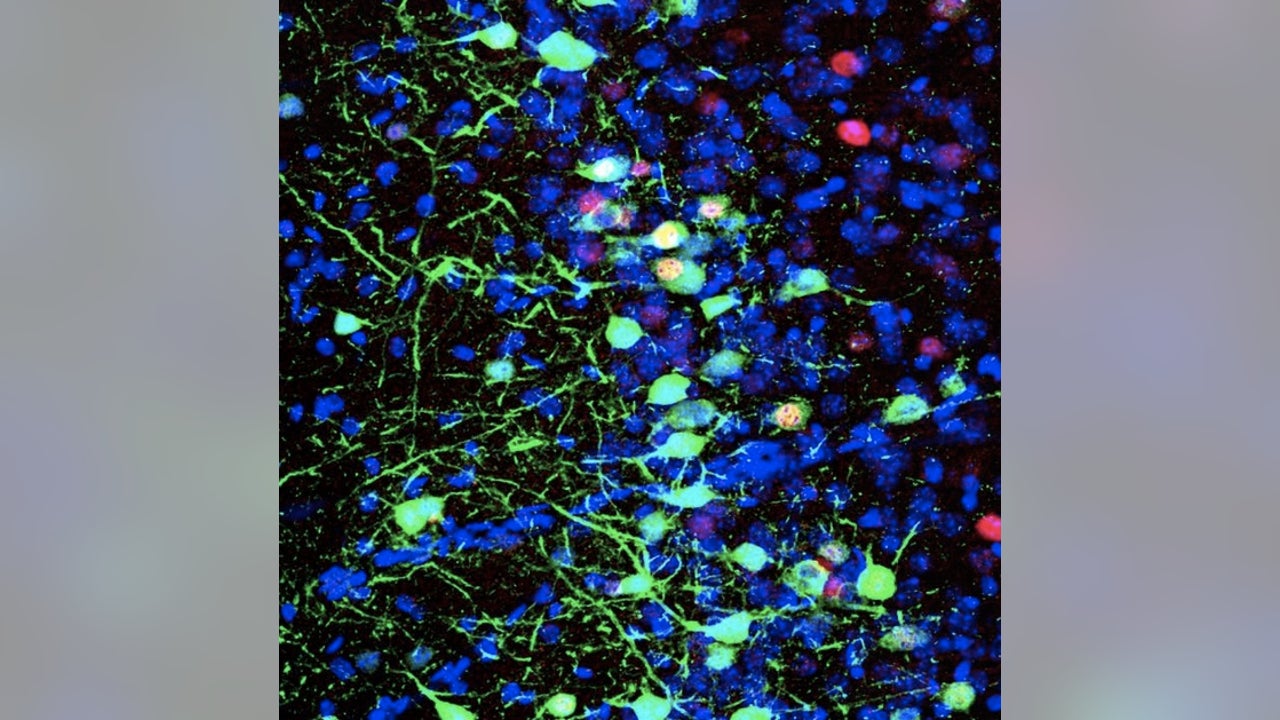 Pyramidal cells in the mouse prelimbic cortex (shown in blue) that were active during the formation of a discrete memory (shown in green). (Dr. Stephanie Grella (Ramirez Lab))