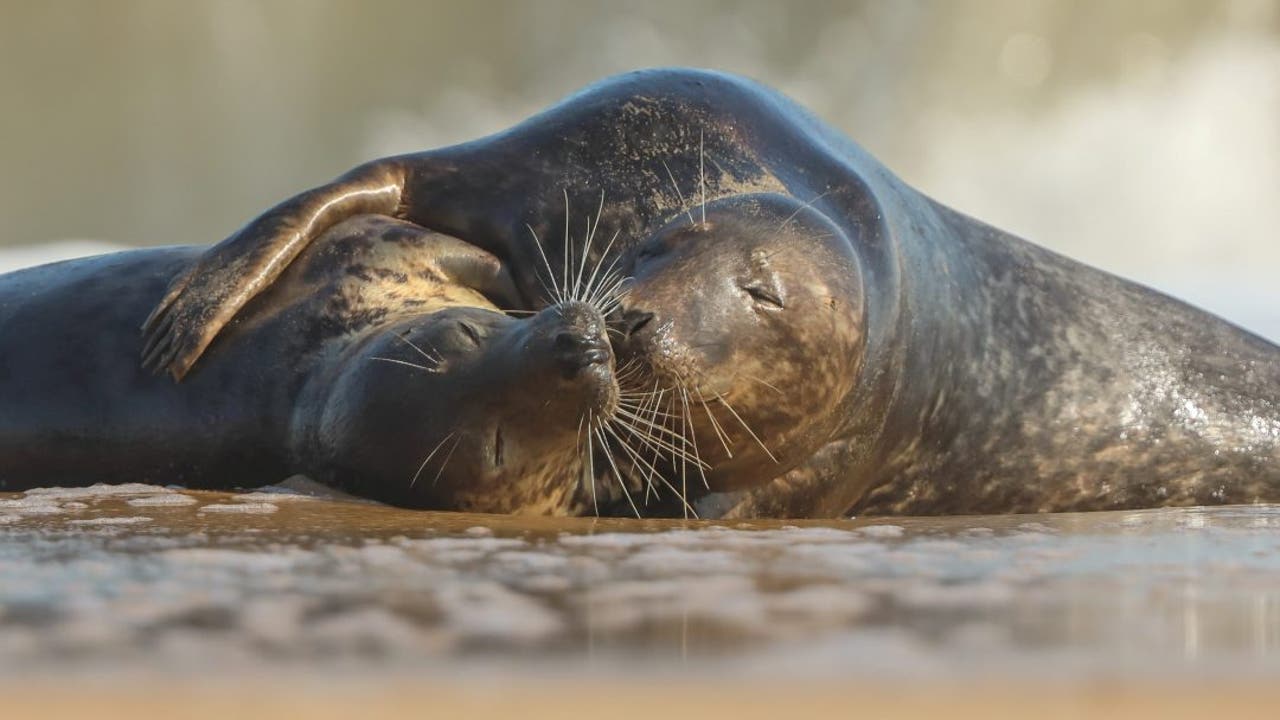 These heartwarming photos show the moment a pair of loved-up seals enjoyed a little 'smooch' on the beach as the waves crashed behind them - like a scene from a film. (Credit: SWNS)