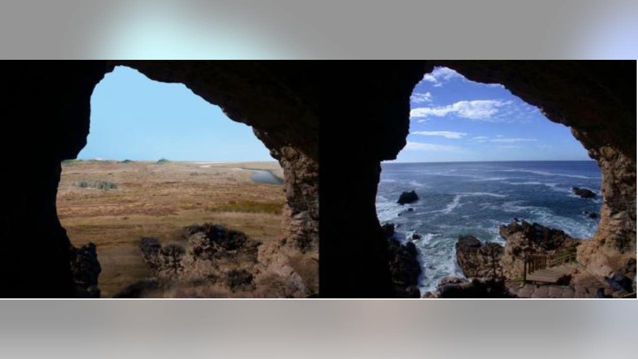 Looking out at the Palaeo-Agulhas Plain from the cave entrance at the Pinnacle Point, South Africa, research site--left, 200,000 years ago during glacial phases and lower sea levels, and right, today where the ocean is within yards of the cave entrances at high tides. (Erich Fisher)