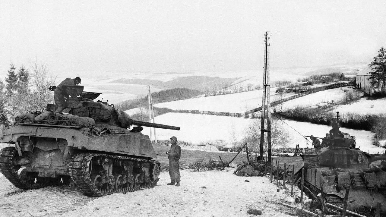In this Jan. 6, 1945 file photo, American tanks wait on the snowy slopes in Bastogne, Belgium during the Battle of the Bulge. (AP Photo, File)