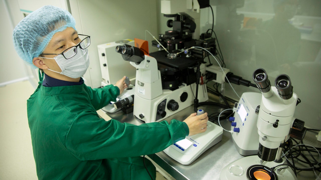 FILE - In this Oct. 9, 2018, file photo, an embryologist who was part of the team working with scientist He Jiankui adjusts a microplate containing embryos at a lab in Shenzhen in southern China's Guandong province. (AP Photo/Mark Schiefelbein, File)