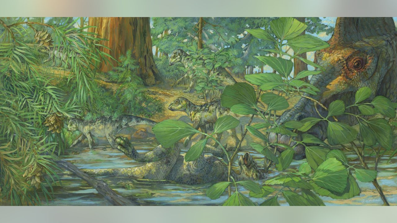 Reconstruction of the nesting ground of Hypacrosaurus stebingeri from the Two Medicine formation of Montana. In the center can be seen a deceased Hypacrosaurus nestling with the back of its skull embedded in shallow waters. A mourning adult is portrayed on the right. (Credit: Michael Rothman, Science China Press)