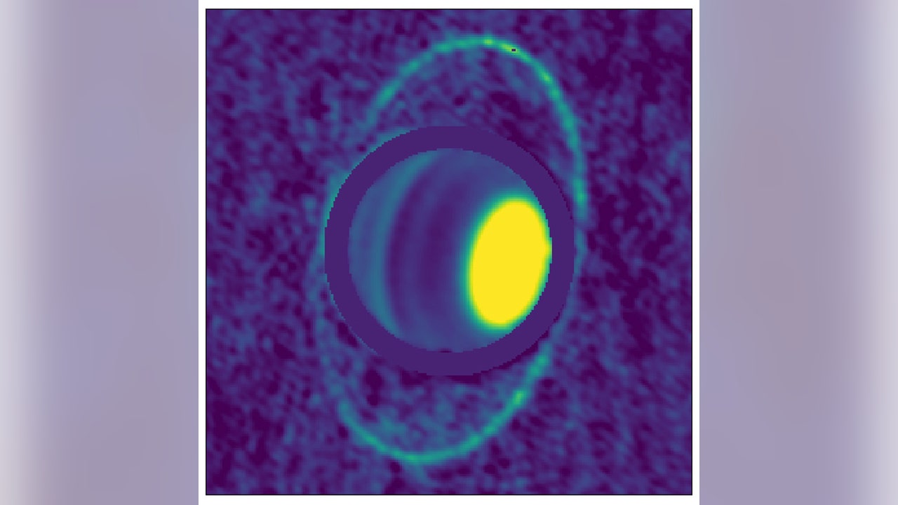 Composite image of Uranus’s atmosphere and rings at radio wavelengths, taken with the ALMA array in December 2017. The image shows thermal emission, or heat, from the rings of Uranus for the first time, enabling scientists to determine their temperature: a frigid 77 Kelvin (-320 F). Dark bands in Uranus’s atmosphere at these wavelengths show the presence of molecules that absorb radio waves, in particular, hydrogen sulfide gas. Bright regions like the north polar spot (yellow spot at right, because Uranus is tipped on its side) contain very few of these molecules. (Credit: Edward Molter and Imke de Pater)