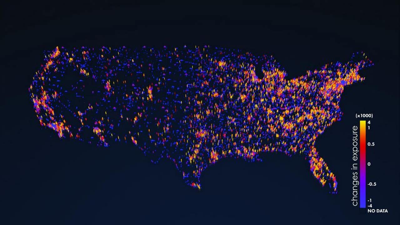 The map displays projected changes in human exposure to extreme climate events at a 1-kilometer scale from 2010 to 2050, which range from minor decreases in rural and suburban areas to moderate and major increases in densely populated urban centers. (Adam Malin/Oak Ridge National Laboratory, U.S. Dept. of Energy)