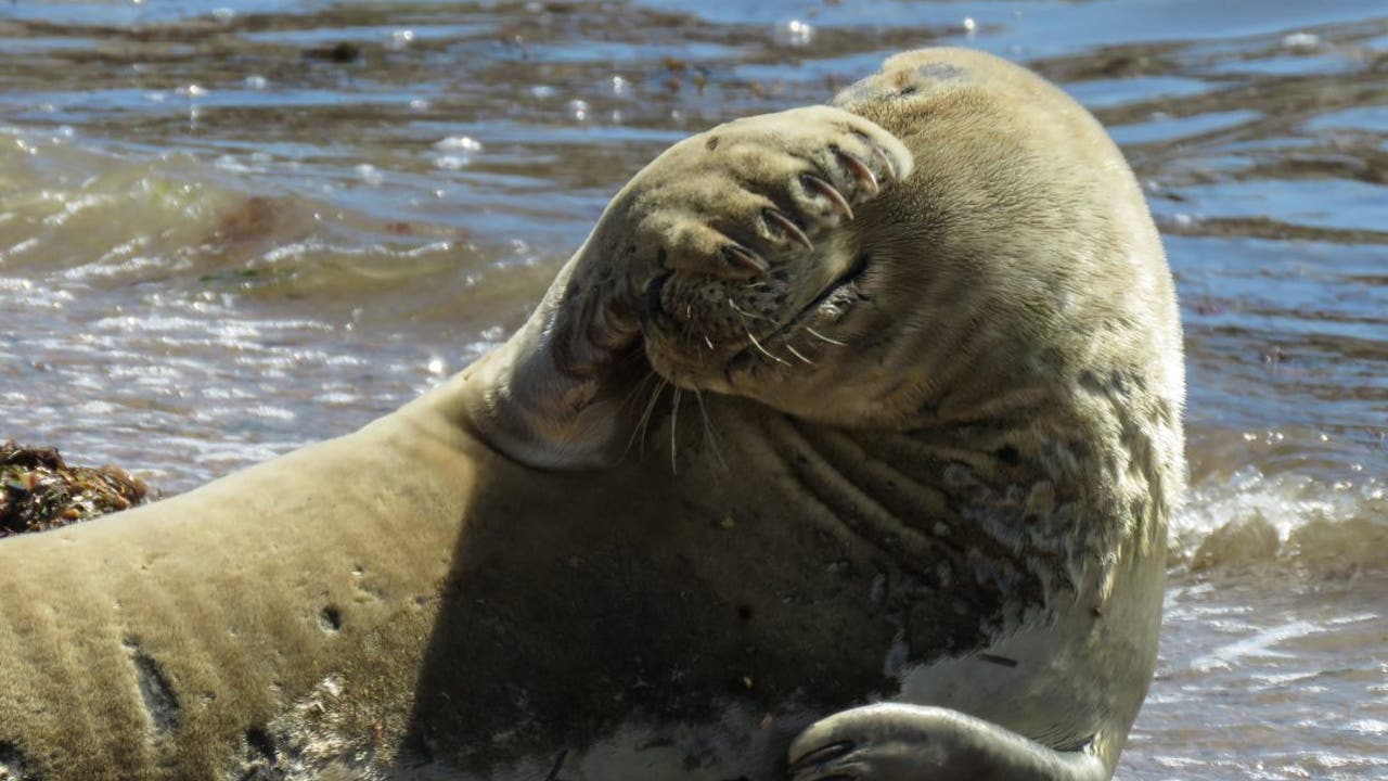 Helen Ford was walking along Weymouth beach in Dorset, England, looking at wildlife, when she saw the seal relaxing on the shore, British news agency SWNS reports.