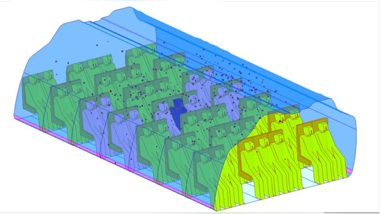 This visualization from Purdue University shows how tiny invisible droplets from a single cough can flow through the cabin of a Boeing 767 passenger jet. The model is based on the assumption that the 2003 SARS virus was airborne. ((Qingyan Chen/Purdue University School of Mechanical Engineering))