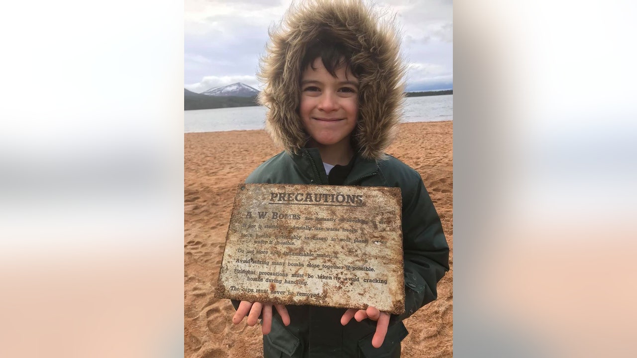 Seven-year-old Patrick McAlindon with a sign from a crate of incendiary bombs he found on a beach at Loch Morlich in the Scottish Highlands on Christmas Day. After just 15 minutes of scanning the beach at Loch Morlich Patrick was stunned when his new gadget showed an “off the scale” reading. (Credit: SWNS)
