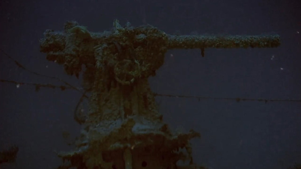 Eerie footage from the sea bed clearly shows the sub’s barnacle-encrusted hull and conning tower, as well as its 12-pounder deck gun. The wreck is sitting at a depth of 130m (427 feet), according to the University of Malta, which notes that her deck gun is facing forward, although her bow is buried in the seabed.