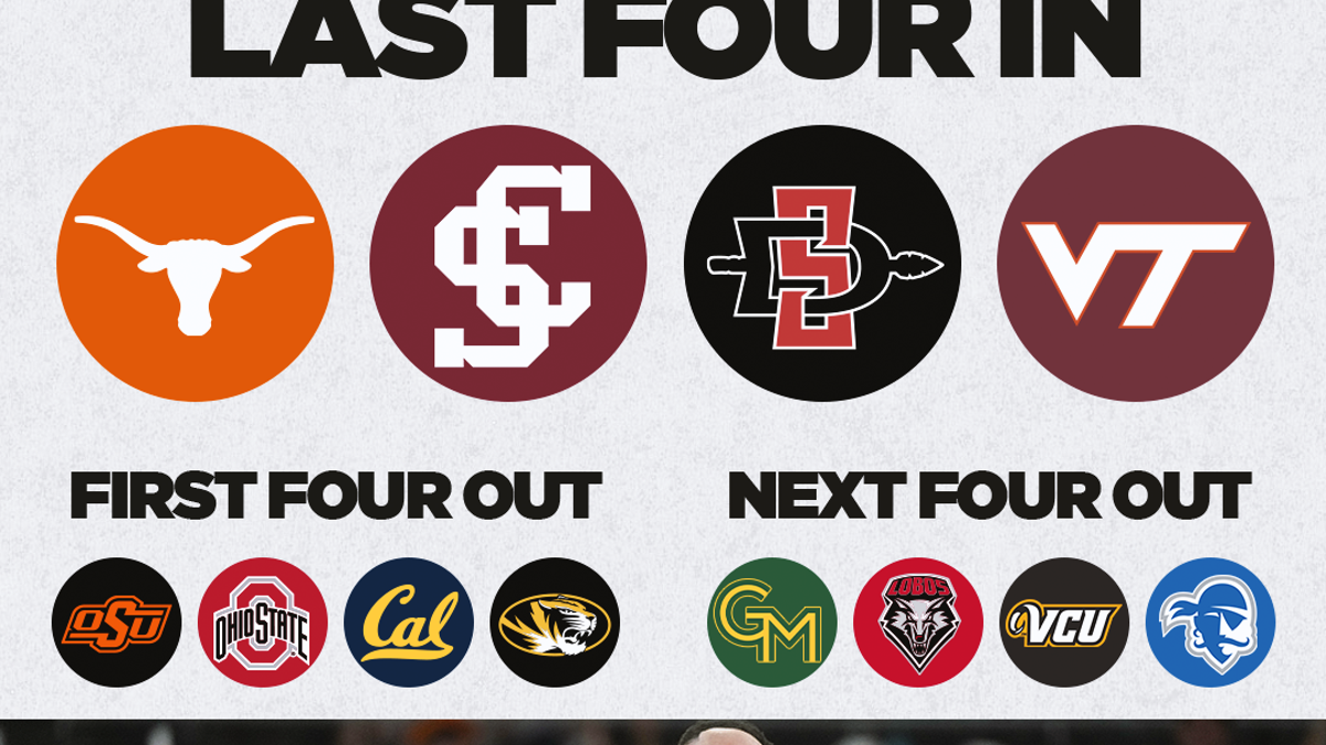According to DeCourcy's projections, Texas, Santa Clara, San Diego State and Virginia Tech are the last four teams in the tournament, while Oklahoma State, Ohio State, Cal and Missouri are the first four out.