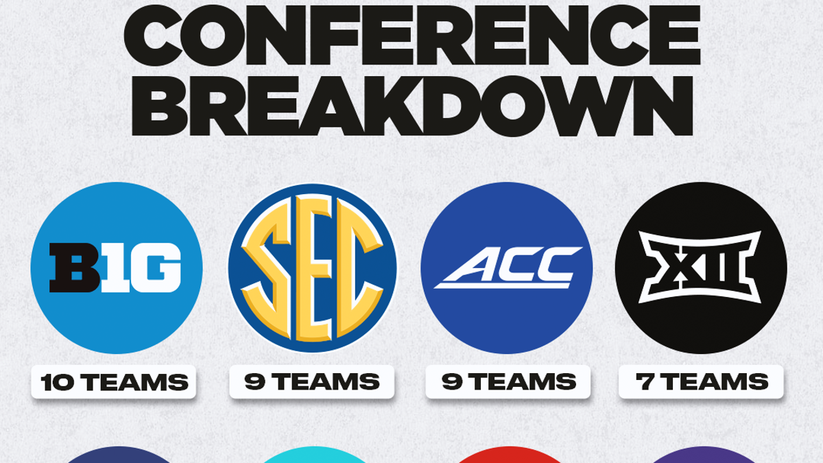 As for conference representation, the Big Ten leads the way with 10 teams in DeCourcy's latest tournament projections, followed by the SEC and ACC with 9 teams each, the Big 12 with 7 teams and the Big East with 4 teams. The West Coast, Atlantic 10 and Mountain West conferences have 2 teams each.