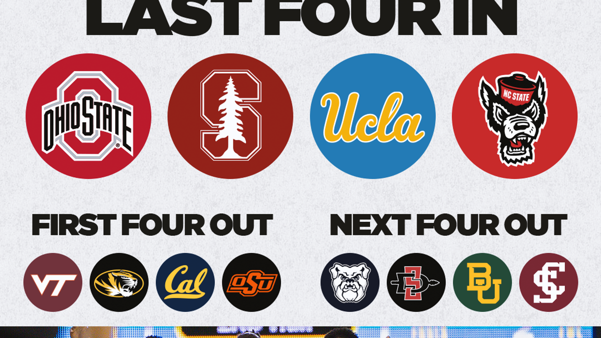 According to DeCourcy's projections, Ohio State, Stanford, UCLA and NC State are the last four teams in the tournament, while Virginia Tech, Missouri, California and Oklahoma State are the first four out.