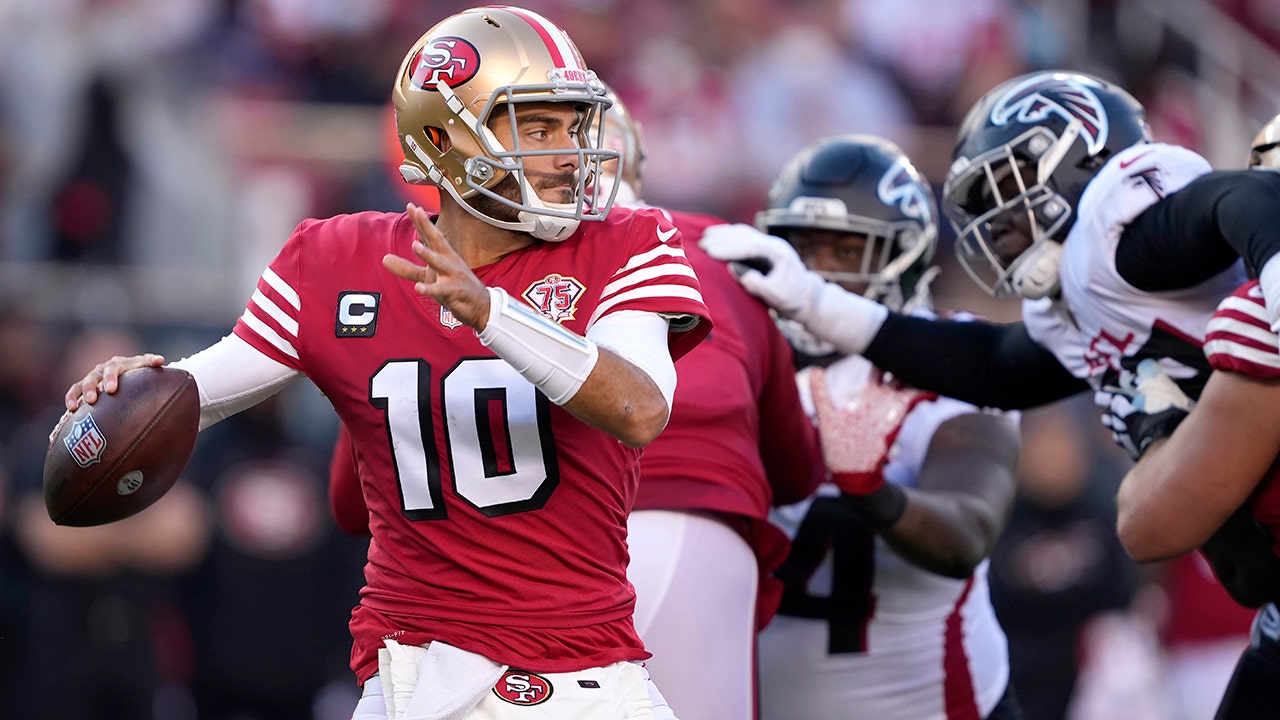 San Francisco 49ers quarterback Jimmy Garoppolo (10) passes against the Atlanta Falcons during the second half of an NFL football game in Santa Clara, Calif., Sunday, Dec. 19, 2021. (AP Photo/Tony Avelar)