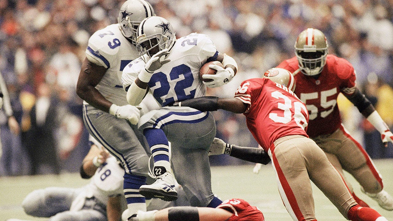 FILE - Dallas Cowboys running back Emmitt Smith (22) makes his way through San Francisco 49ers' defensive backs Merton Hanks (36) and Bill Romanowski (53), for a 4-yard gain in the second quarter of the Cowboy's 38-21 NFC championship win, Sunday, Jan. 23, 1994, in Irving, Texas. Few rivalries have had as many big games or star players like Roger Staubach, Joe Montana, Jerry Rice, Emmitt Smith, Deion Sanders, Steve Young, Troy Aikman and Michael Irvin. (AP Photo/Eric Gay, File)