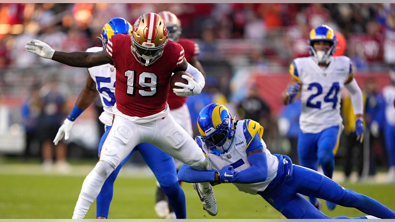 Wide receiver Deebo Samuel #19 of the San Francisco 49ers rushes for a touchdown as he breaks a tackle by cornerback Jalen Ramsey #5 of the Los Angeles Rams during the second quarter at Levi's Stadium on October 03, 2022 in Santa Clara, California. (Thearon W. Henderson/Getty Images)