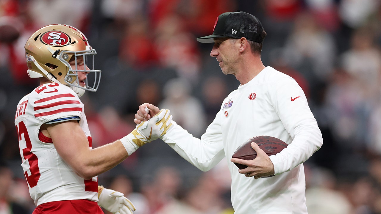 Head coach Kyle Shanahan, right, of the San Francisco 49ers, interacts with Christian McCaffrey prior to the Super Bowl against the Kansas City Chiefs at Allegiant Stadium Feb. 11, 2024, in Las Vegas. (Ezra Shaw/Getty Images)
