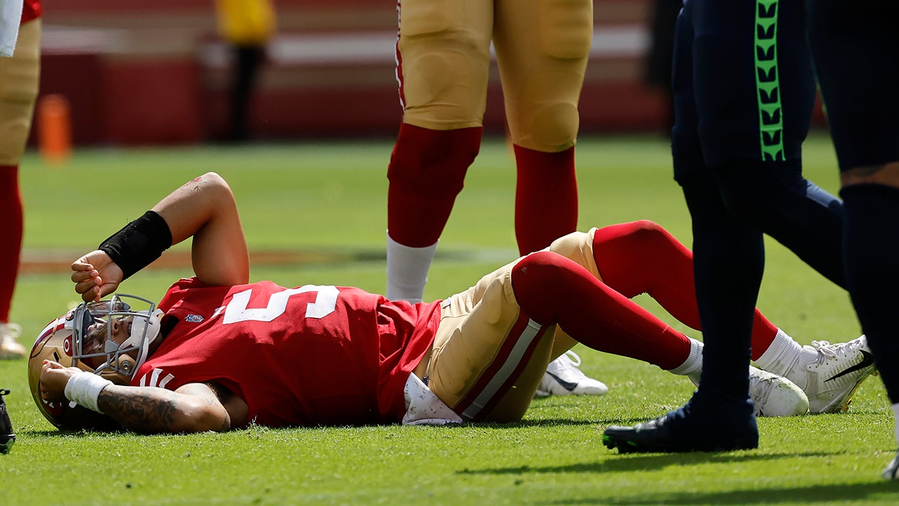 San Francisco 49ers quarterback Trey Lance lies on the field after being tackled during the Seattle Seahawks game in Santa Clara, California, Sunday, Sept. 18, 2022. (AP Photo/Josie Lepe)