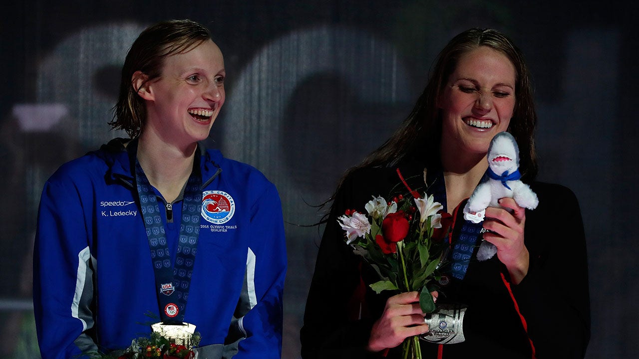 Katie Ledecky, left, and Missy Franklin participate in the medal ceremony for the Womens 200 Meter Freestyle during Day Four of the 2016 U.S. Olympic Team Swimming Trials at CenturyLink Center on June 29, 2016 in Omaha, Nebraska. (Al Bello/Getty Images)