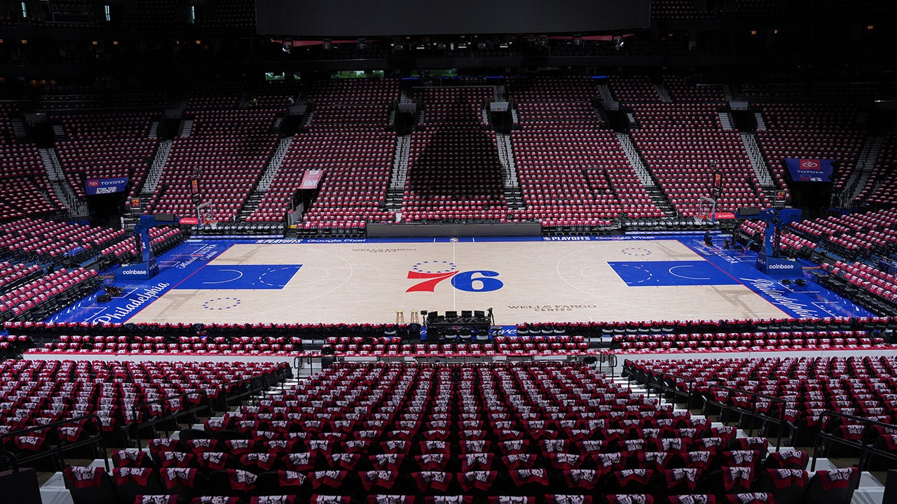 Wells Fargo Center in Philadelphia is seen before Game 4 between the New York Knicks and the Philadelphia 76ers during Round 1 of the 2024 NBA Playoffs on Sunday. (Jesse D. Garrabrant/NBAE via Getty Images)