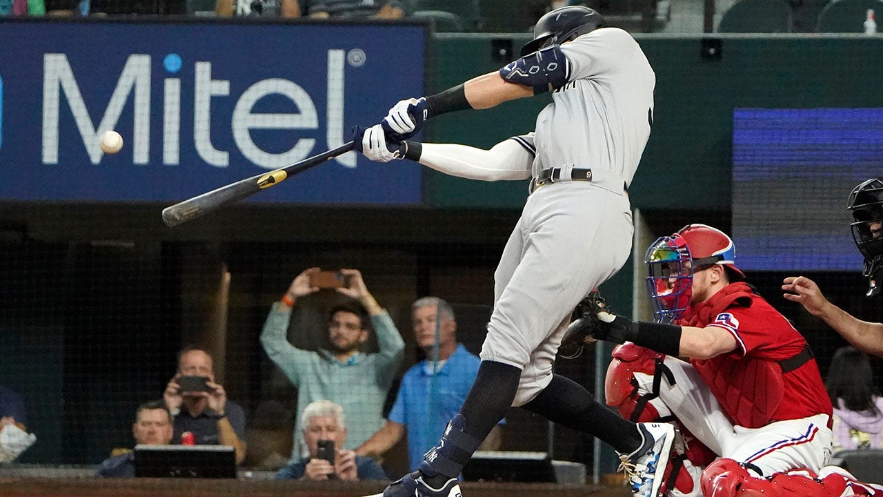 New York Yankees' Aaron Judge hits a solo home run, his 62nd of the season, during the first inning in the second baseball game of a doubleheader against the Texas Rangers in Arlington, Texas, Tuesday, Oct. 4, 2022. With the home run, Judge set the AL record for home runs in a season, passing Roger Maris. (AP Photo/LM Otero)