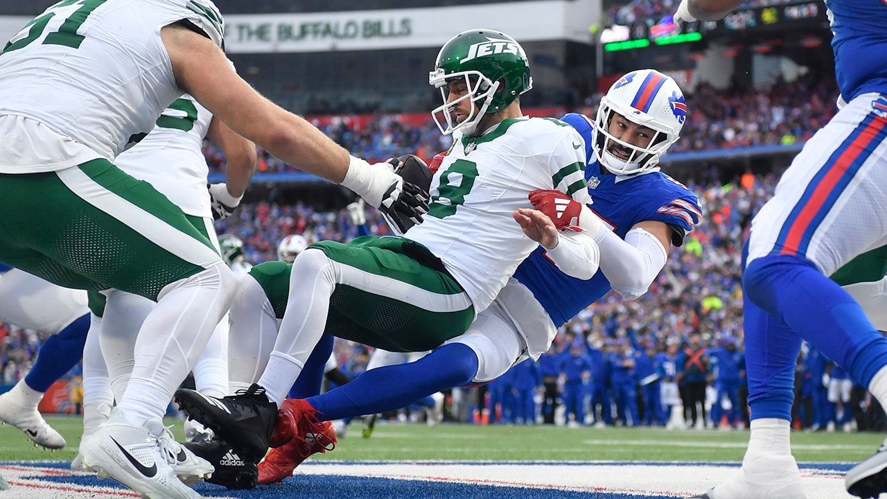 New York Jets quarterback Aaron Rodgers (8) is sacked by Buffalo Bills defensive end AJ Epenesa, right, in the end zone for a safety during the first half of an NFL football game on Sunday, Dec. 29, 2024, in Orchard Park, N.Y. (AP Photo/Adrian Kraus)