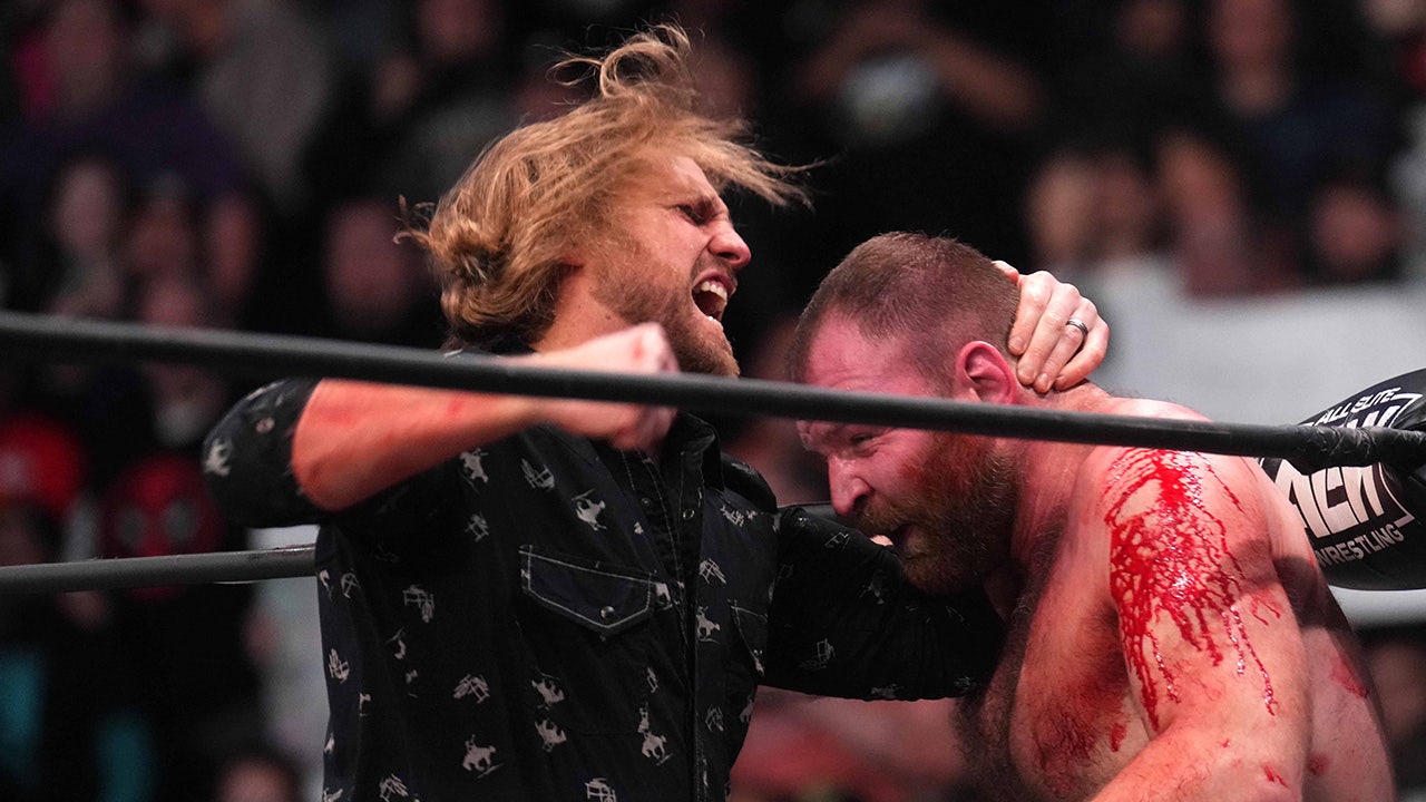Hangman Adam Page, left, and Jon Moxley during AEW Dynamite at Footprint Center in Phoenix, Arizona, on Feb. 22, 2023. (Joe Camporeale-USA Today Sports)
