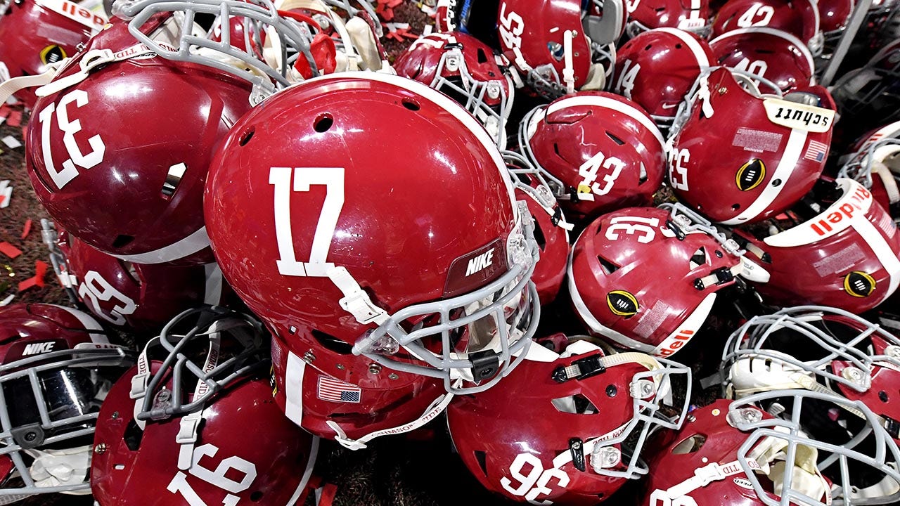 Alabama Crimson Tide helmets after they beat the Georgia Bulldogs in the 2018 CFP national championship game at Mercedes-Benz Stadium in Atlanta Jan. 8, 2018. (John David Mercer/USA Today Sports)