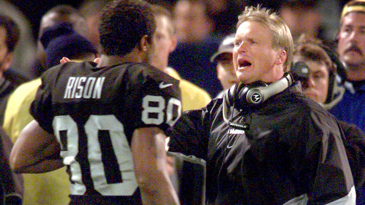 Oakland, CA December 10, 2000: Raiders coach Jon Gruden talks with Andre Rison during a rout of the Jets. (Getty Images)