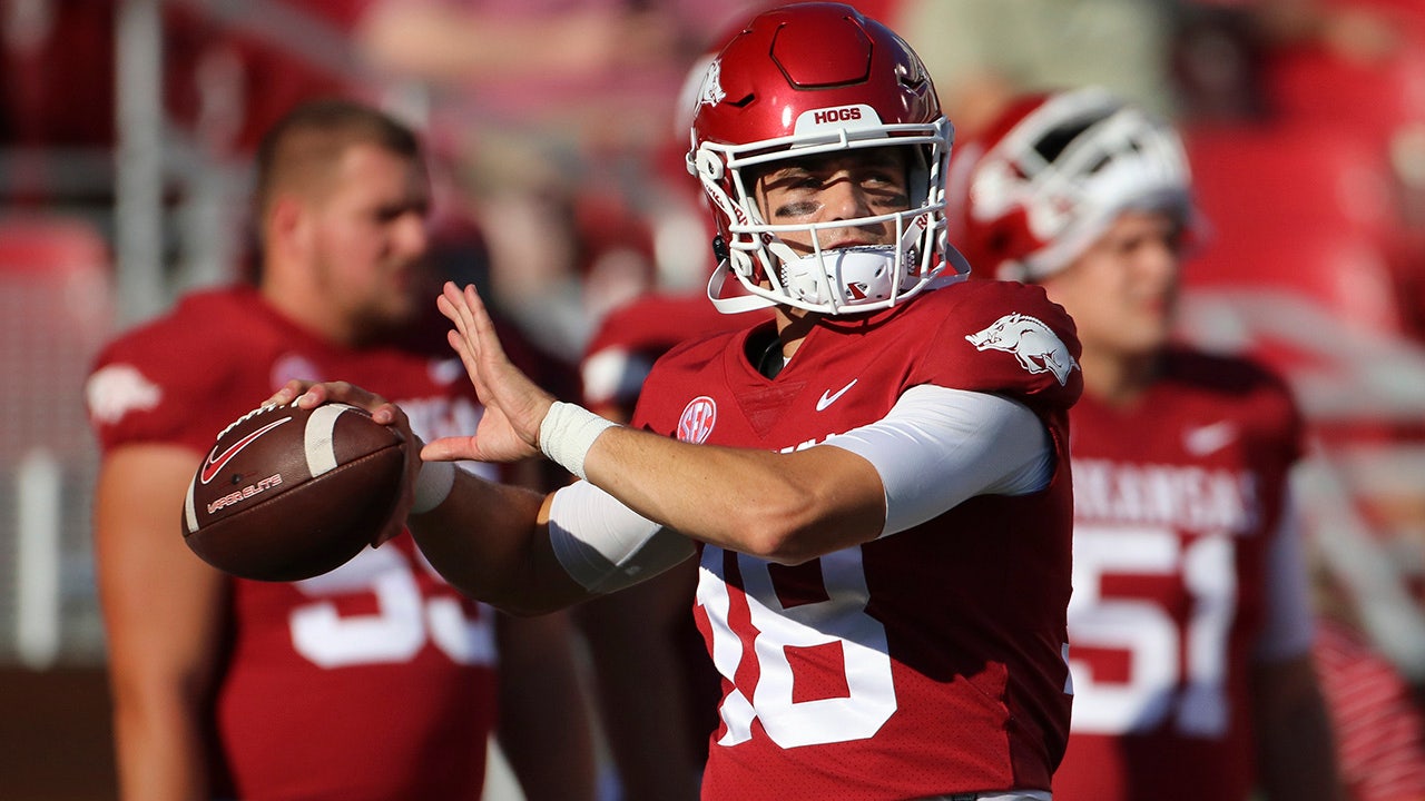 Arkansas Razorbacks quarterback Kade Renfro, #18, before the college football game between the Missouri State Bears and Arkansas Razorbacks on Sept. 17, 2022, at Donald W. Reynolds Razorback Stadium in Fayetteville, Arkansas. (Andy Altenburger/Icon Sportswire via Getty Images)